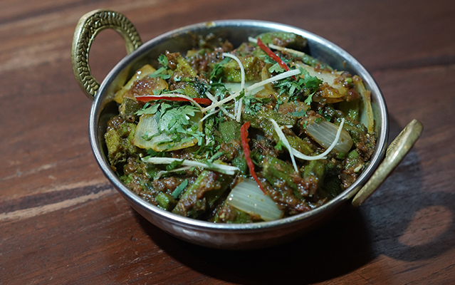 Succulent pieces of baby okra cooked in an onion gravy and baby onions
