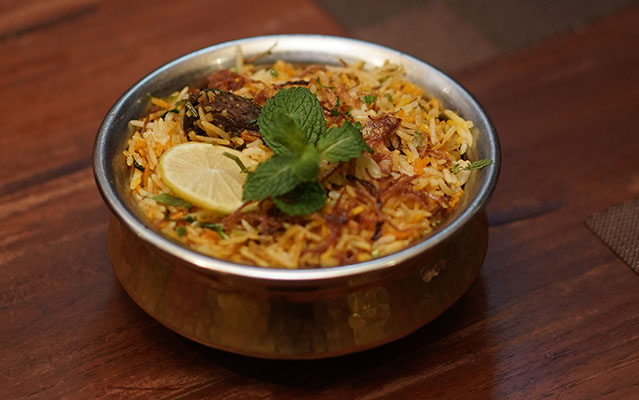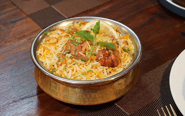 Spicy chicken cooked along with rice and special spices from Hyderabad. Served with raita