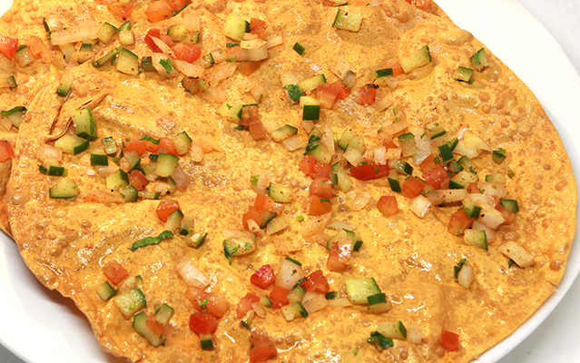 Spicy indian crackers, flavored with black pepper and topped with onion and tomatoes