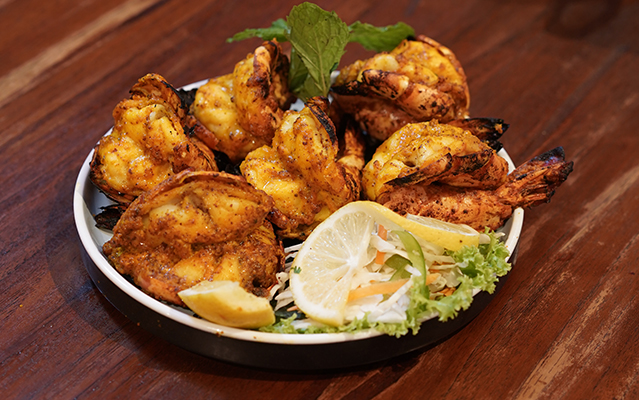 Tiger prawns marinated in mustard powder and spices, cooked on charcoal