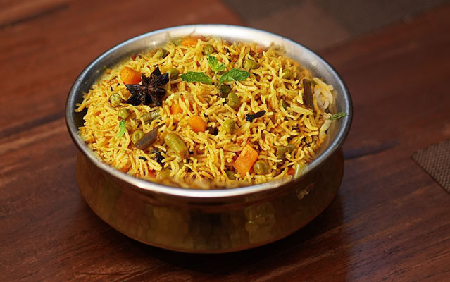Basmati rice simmered with fresh vegetables, finished with brown onion. Served with raita